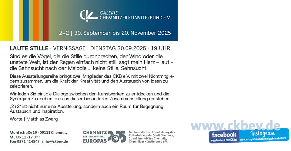 Diese Ausstellungsreihe bringt zwei Mitglieder des CKB e.V. mit zwei Nichtmitgliedern zusammen, um die Kraft der Kreativität und den Austausch von Ideen zu zelebrieren. Wir laden Sie ein, die Dialoge zwischen den Kunstwerken zu entdecken und die Synergien zu erleben, die aus dieser besonderen Zusammenstellung entstehen. „2+2“ ist nicht nur eine Ausstellung, sondern auch ein Raum für Begegnung, Austausch und Inspiration.